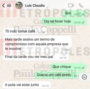 De acordo com o print, Luiz Cláudio conversava com a sua mulher,  e em certo ponto do papo, chegam a citar a primeira dama, Rosângela Lula da Silva, mais conhecida como janja, a Madrasta, demonstrando não gostar da presença dela.