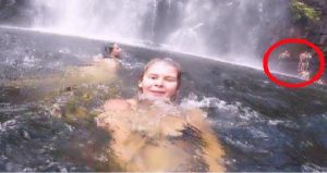 Registrando com a sua câmera “GoPro”, Anneka Bading, de férias, aproveitou para nadar ao lado de uma cachoeira. Ela queria imortalizar aquele momento e as imagens espetaculares daquela cachoeira azul e limpa.