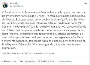 Lula se manifestou deixando sua homenagem para atriz.