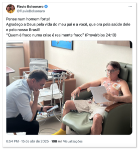 Flávio Bolsonaro mencionou a força do pai, “Pense num homem forte! Agradeço a Deus pela vida do meu pai e a você, que hora pela saúde dele e pelo nosso Brasil!”, disse, agradecendo o apoio e as orações dos seguidores.