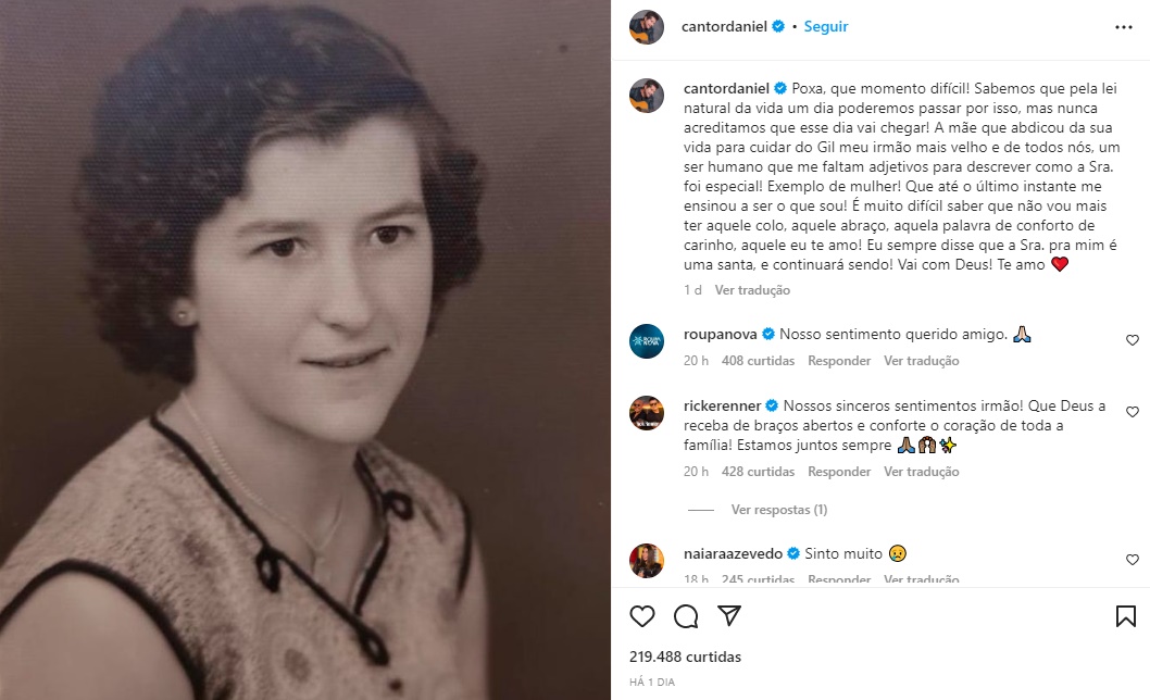 O cantor Daniel publicou uma homenagem a sua mãe e escreveu: “Poxa, que momento difícil! Sabemos que pela lei natural da vida um dia poderemos passar por isso, mas nunca acreditamos que esse dia vai chegar! A mãe que abdicou da sua vida para cuidar do Gil meu irmão mais velho e de todos nós, um ser humano que me faltam adjetivos para descrever como a Sra. foi especial!”.