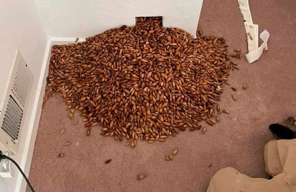 Para resolver o problema, Nick Castro abriu a estrutura da parede e acabou se deparando com uma cena bizarra. O profissional se deparou com mais de 300 kg de um fruto do Carvalho semelhante a uma noz. O especialista encontravam destas bolotas em todas as partes da parede da residência. Eles encheram cerca de oito sacos grandes de lixo.