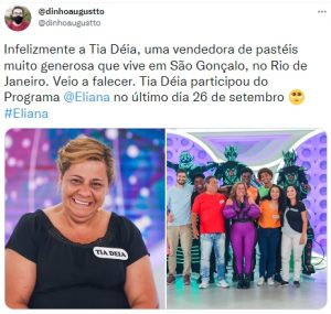 Deia teve sua história contada no programa Eliana no dia 26 de setembro. A vendedora de pastéis, muito generosa, de acordo com as palavras da própria apresentadora, ela faleceu no dia 7 de outubro, vítima de infarto.
