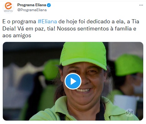 “Infelizmente ela não teve a chance de aproveitar os frutos que colheu aqui conosco. Tia Deia partiu de uma maneira muito prematura e inesperada. Esse programa é dedicado a ela, meus profundos sentimentos à família e que Deus conforte a todos”, lamentou Eliana.