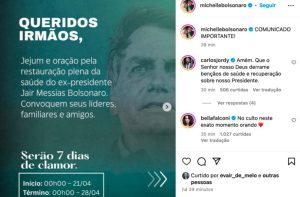As ex-primeira-dama pede para todos os apoiadores de Jair bolsonaro (PL), façam uma campanha de jejum e oração pela “restauração plena da Saúde” do marido, que se encontra internado após cirurgia.