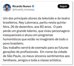 O prefeito de São Paulo também foi um dos que se manifestaram, lamentando a morte de Ney Latorraca.