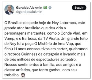 Já o vice-presidente Geraldo Alckmin, destacou memórias de Ney Latorraca na televisão, como na novela Vamp e outros.
