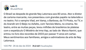 Após saberem da morte do nosso querido ator Ney Latorraca, muitos políticos se manifestaram. Em seu perfil no X, o presidente Lula se expressou dizendo que o ator tinha um “carisma marcante” e presenteou os brasileiros “com grandes papéis na televisão e no teatro”. “Meus sentimentos aos familiares, amigos e admiradores da arte de Ney Latorraca”, disse.