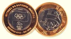 5- Bandeira dos Jogos Olímpicos: A ultima moedinha de nossa lista, é a moeda que carrega a imagem do celo dos jogos olímpicos.Foram distribuidas cerca 2 milhões destas em 2012 e hoje elas podem valer até R$ 100.