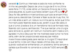 “Continuo internada e cada dia mais confiante na minha recuperação! Depois de uma cirurgia de 8 hs na última sexta feira (11/10), onde retirei um Sarcoma Sinovial da minha coxa esquerda, eu quero que todos saibam que a FÉ cura”, atualizou Vera no instagram.