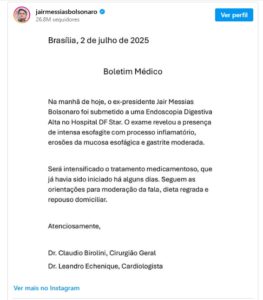 Os médicos chegaram a divulgar o boletim médico que revelou o real estado de saúde do político. “Na manhã de hoje [quarta], o ex-presidente Jair Messias Bolsonaro foi submetido a uma endoscopia digestiva alta no Hospital DF Star. O exame revelou a presença de intensa esofagite com processo inflamatório, erosões da mucosa esofágica e gastrite moderada”, revelou a nota hospitalar.